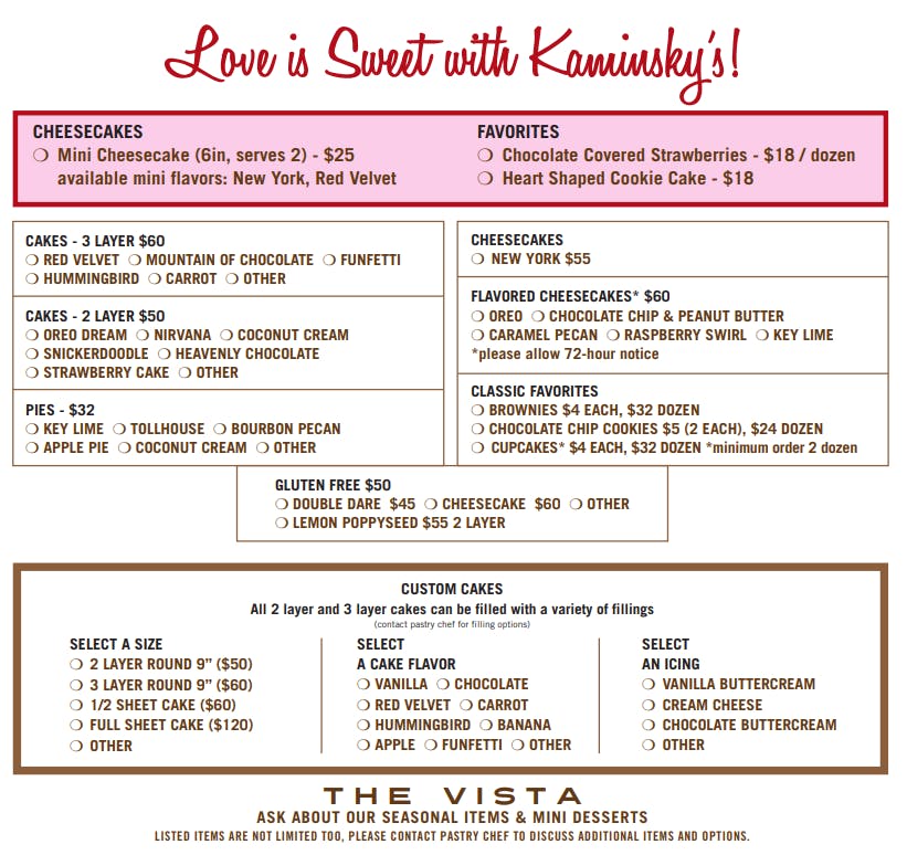 ARE PREPARED FRESH DAILY BY OUR PASTRY CHEFS AND ARE CHANGED NUMEROUS TIMES THROUGHOUT THE DAY. PLEASE EXPLORE OUR DESSERT CASE LOCATED NEAR THE FRONT DOOR FOR TODAY’S SELECTIONS.